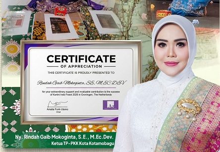 Berita-BMR.com | Kotamobagu — Kiprah budaya lokal kembali mencuri perhatian di panggung internasional. Ketua Tim Penggerak PKK Kota Kotamobagu, Rindah Gaib Mokoginta, sukses mengharumkan nama daerah setelah menerima penghargaan bergengsi dalam ajang Kartini Indo Feest 2026 yang digelar di Groningen, Belanda.